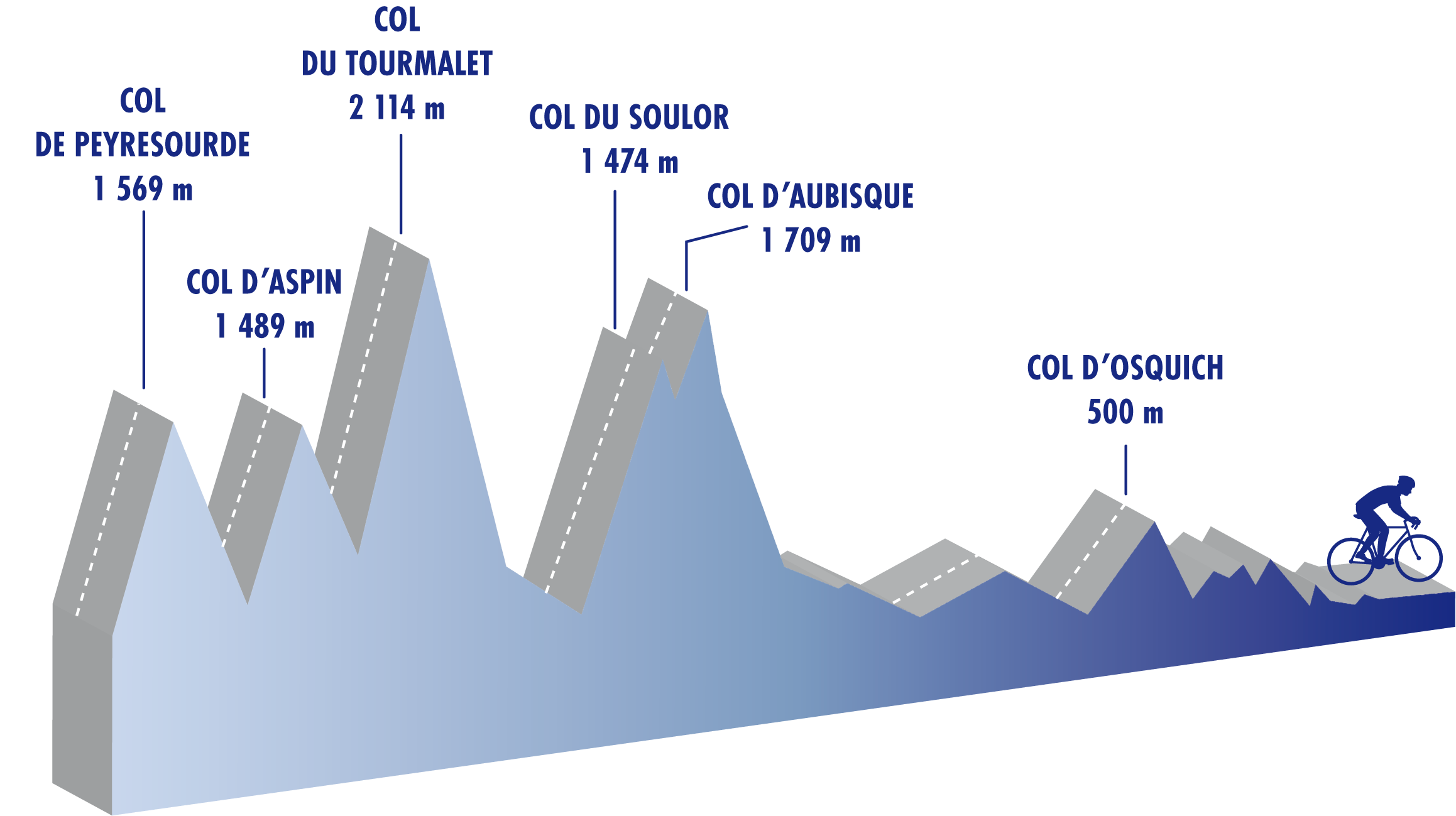 À Sainte-Marie-de-Campan et sa verte vallée, débutera un très gros obstacle de 18 km de long avec des passages de 7 à 14 % : le Tourmalet. À son sommet, après 38 km de descente vous récupérerez jusqu’à Argelès-Gazost. Le col du Soulor se trouve 20 km plus haut et le col d’Aubisque ne sera qu’une simple formalité de ce côté. Il restera encore 180 km du Béarn au Pays Basque en passant par le col d’Osquich et quelques côtes qui vous mèneront à Bayonne où une collation bien méritée vous sera offerte.